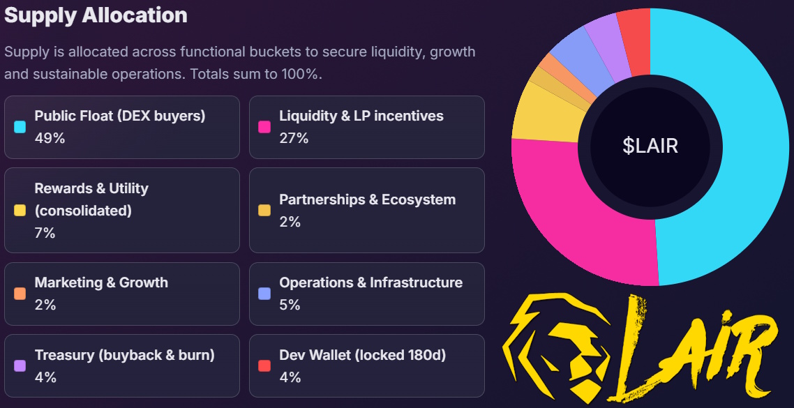 - Liquidity & LP incentives (27%) — initial/ongoing LP provisioning and KPI-based incentives; periodic locks, anti-rug policy.